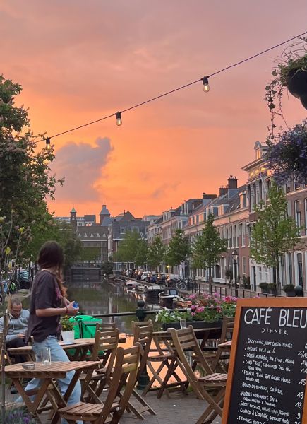Feeling blue? Laat je hier opvrolijken. Grote kans dat je hier op het mooiste stukje gracht van Den Haag zit. En op de scheefste. De zonsondergang meepakken op het terras, doe je hier.