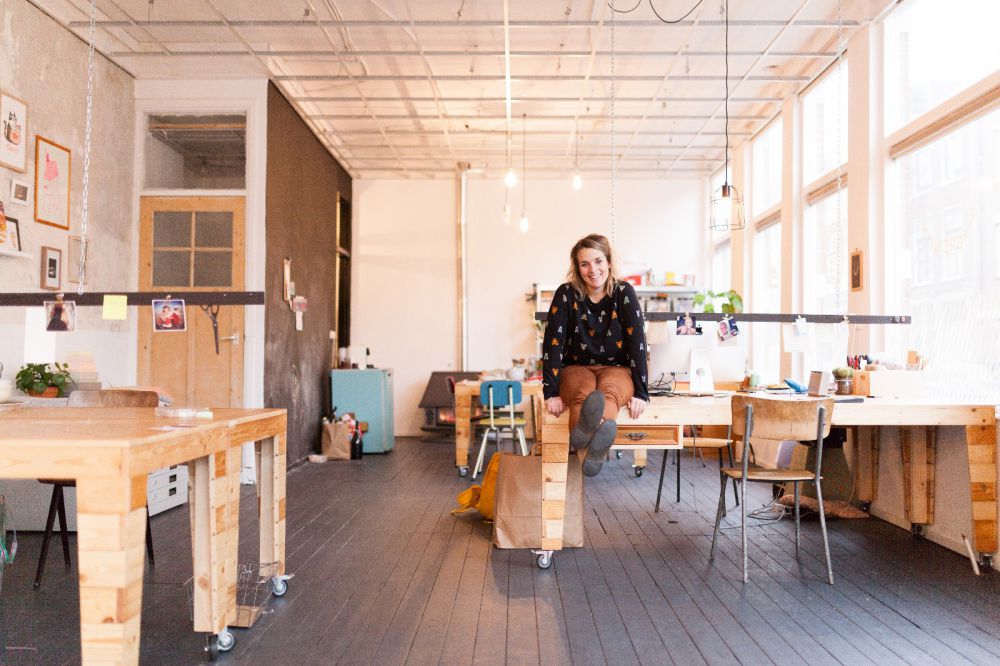 ''Ongeveer zes jaar geleden ben ik dat begonnen met huren samen met Lidwien van Kempen, theatervormgever. Het pand was van een oud supermarkt. Het zag er niet uit, het was echt een zooitje! Er was geen eens een CV-ketel. Maar we vonden de plek zo gaaf. Marloes Kroeze, ook een illustrator, wilde ook aanschuiven. Nu is het een plek geworden waarin zes mensen met verschillende creatieve beroepen werken.''