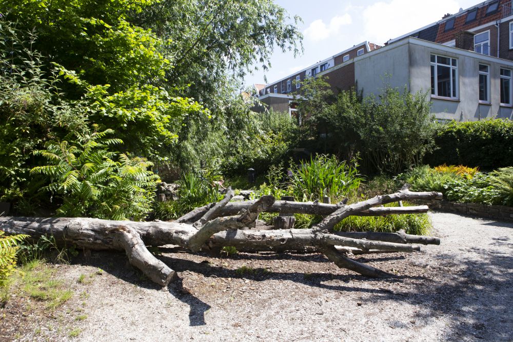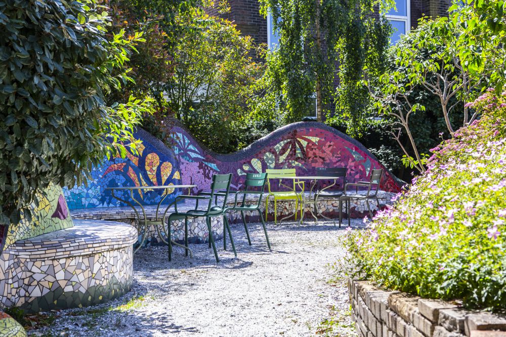 Inmiddels is de tuin een sprookje voor elke natuurliefhebber. Als je de door de grote stalen hekken op de Galileistraat bent gelopen is er een kleine gang die je leidt naar de tuin. Een ode aan de oude boksschool en boeken over planten en insecten hangen verspreid aan de muur. Met een beetje geluk vind je een baksel van buurtgenoten of heeft iemand neem-gratis-mee-spullen achtergelaten. Eenmaal in de tuin sta je versteld dat je deze ruimte en rust hebt kunnen vinden achter de Weimarstraat. Een grote bank betegeld met mozaïek steentjes. Holke’s kleine huisjes, haar houten kiosk voor koffie en thee. Een podium. Een pluktuin. Vlinders die langs je heen vliegen. De vrijwilligers zorgen ervoor dat alles er tip top eruit ziet.