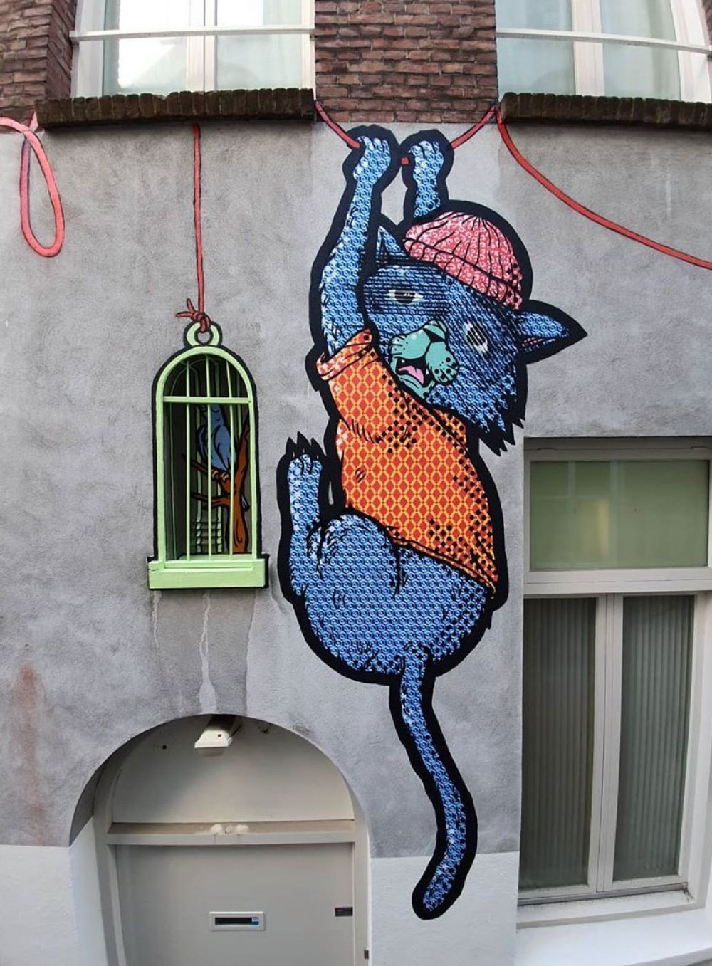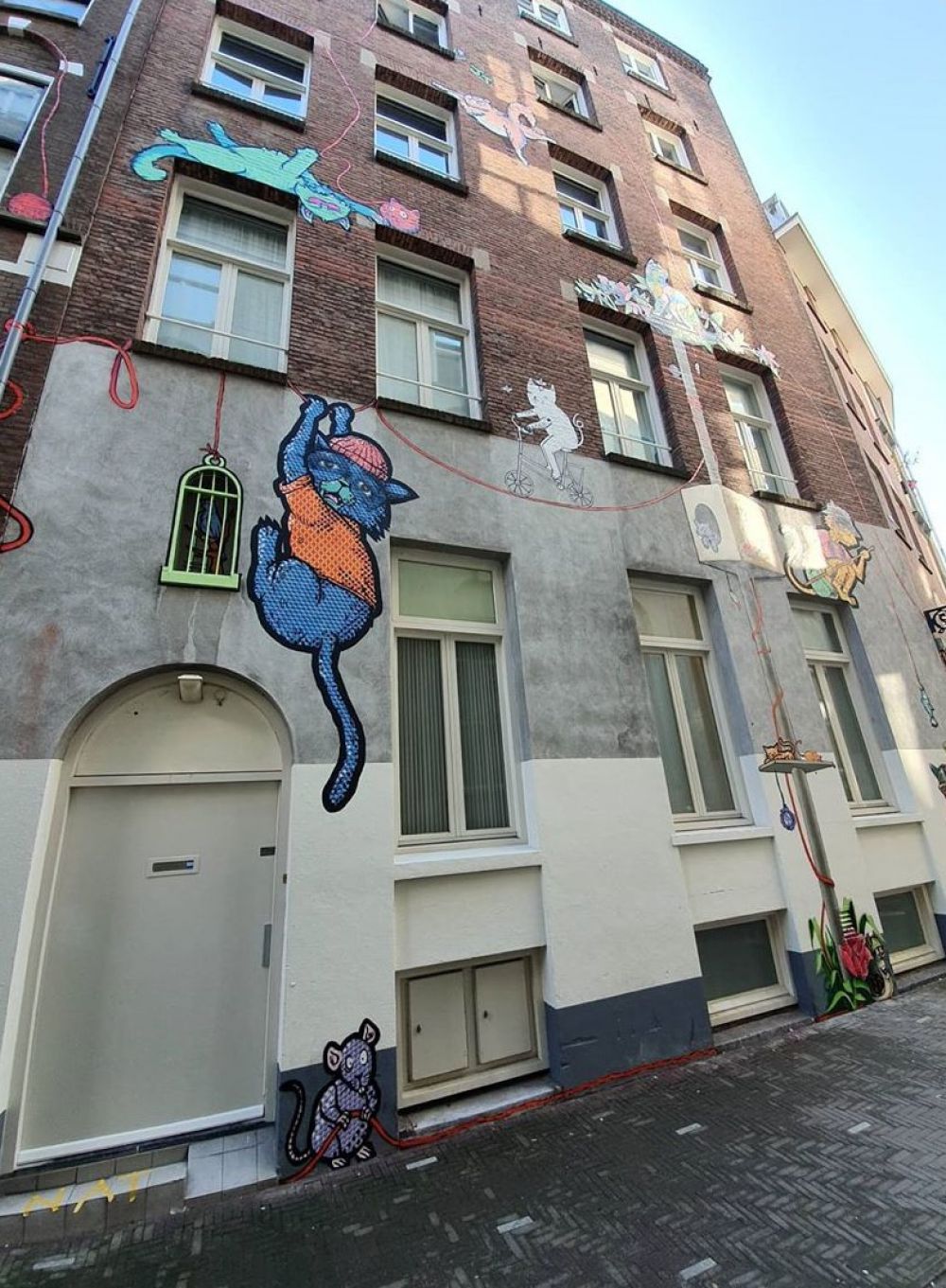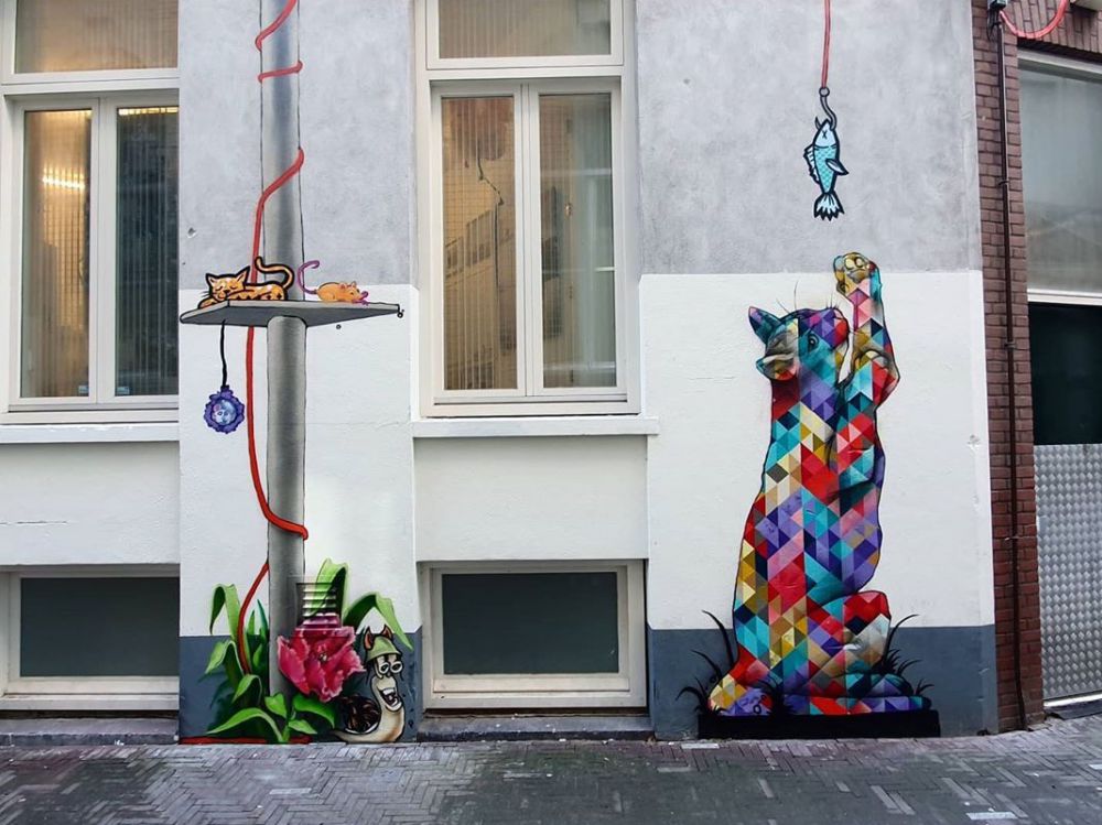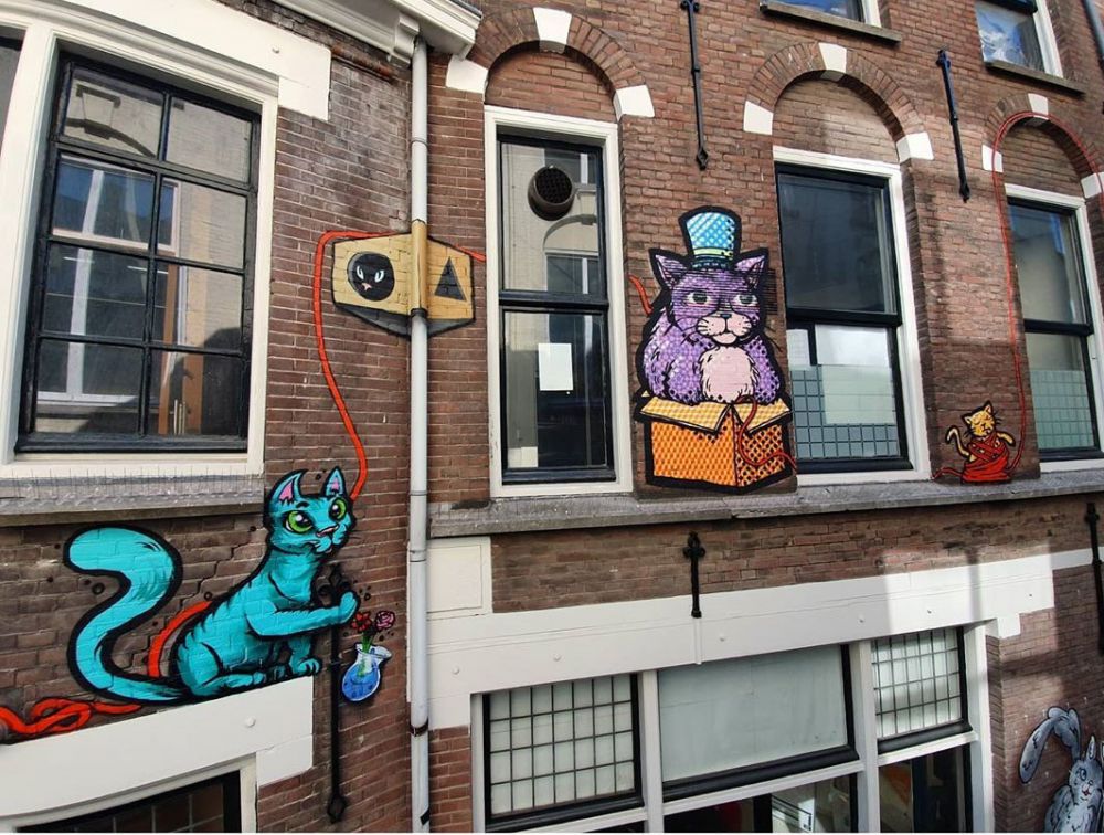 Zes verschillende kunstenaars zijn bezig geweest met deze muurvaste schilderingen. Ieder in zijn eigen stijl. Van katten die bang zijn voor muizen tot de regenpijp als krabpaal. Genoeg poespas, want als je goed kijkt zie je dat elke kat verbonden staat met een ander. Komt dat zien, deze ietwat verlaten steeg is nog nooit zo vrolijk geweest!