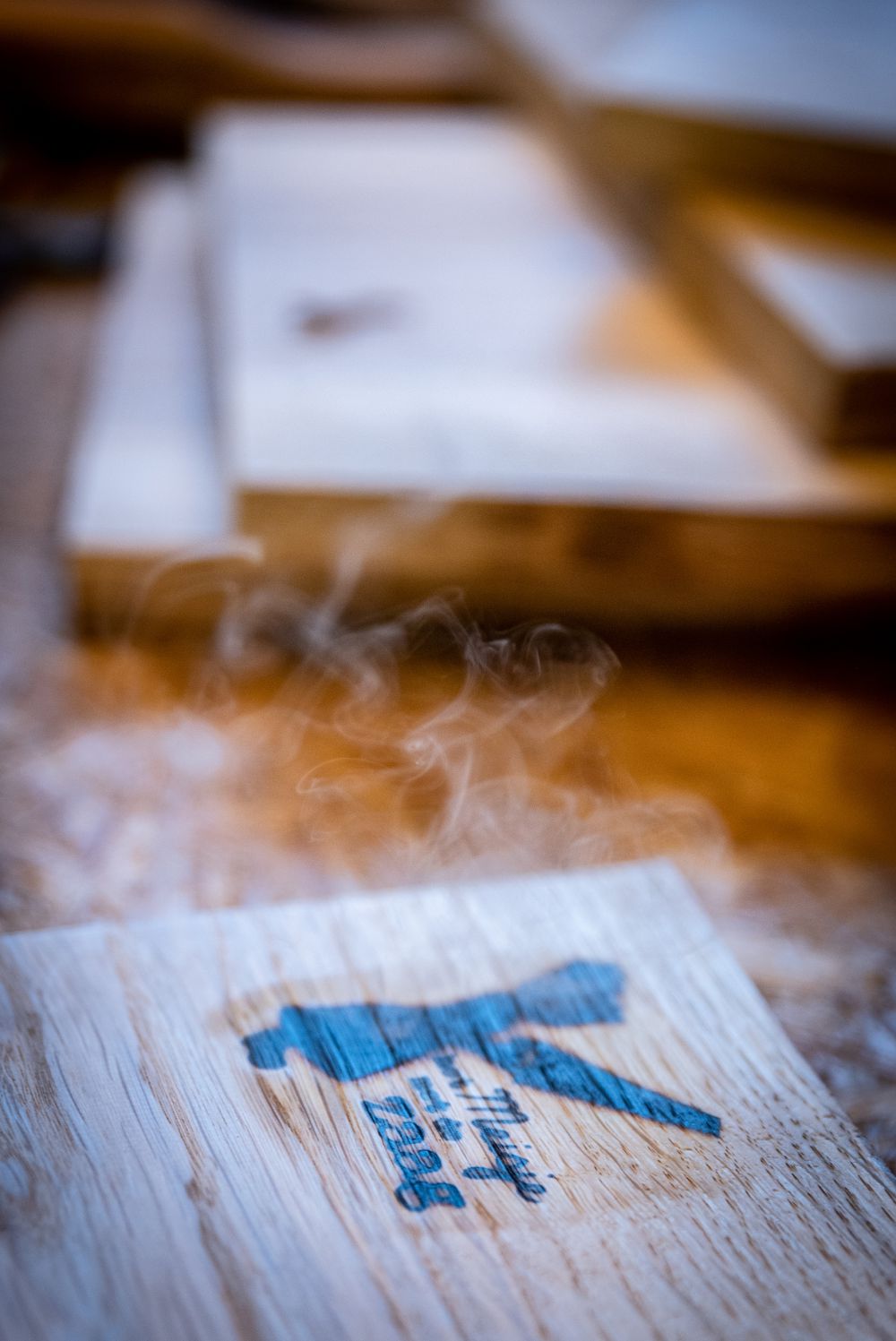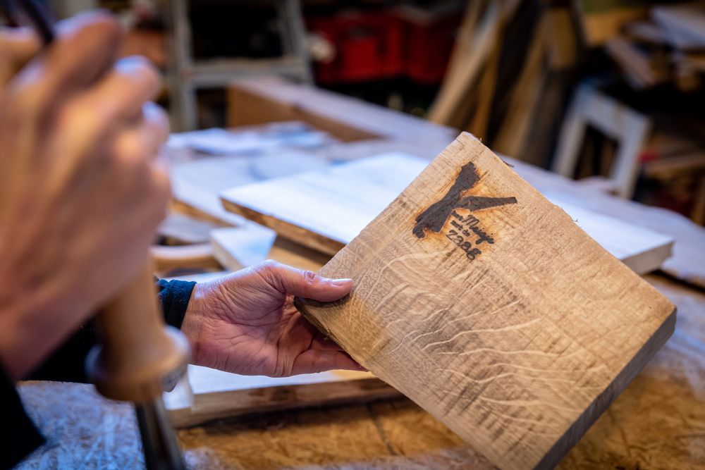 Met een handbrandstempel wordt het logo op de plank gedrukt