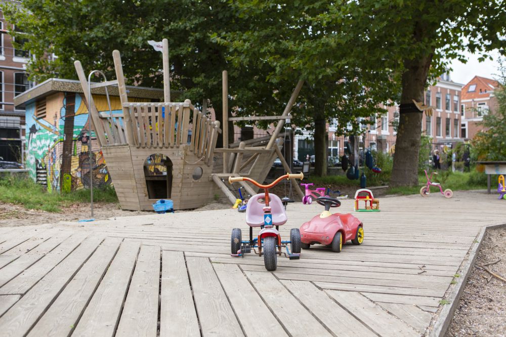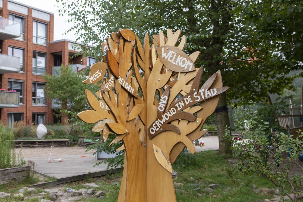 Niet heel lang geleden was de tuin nog een stuk braakliggend terrein. Uiteindelijk staken buurtbewoners, architecten en kinderen de koppen bij elkaar om een nieuw concept te bedenken. Samen kwamen ze tot het ontwerp voor de tuin zoals ‘ie nu is. Daarvoor hebben ze vooral gekeken naar wat er al wél in huis was. Naar materialen uit de stad die ze konden hergebruiken bijvoorbeeld. En daar zijn nu zitplekken, tafels en speeltoestellen van gemaakt.